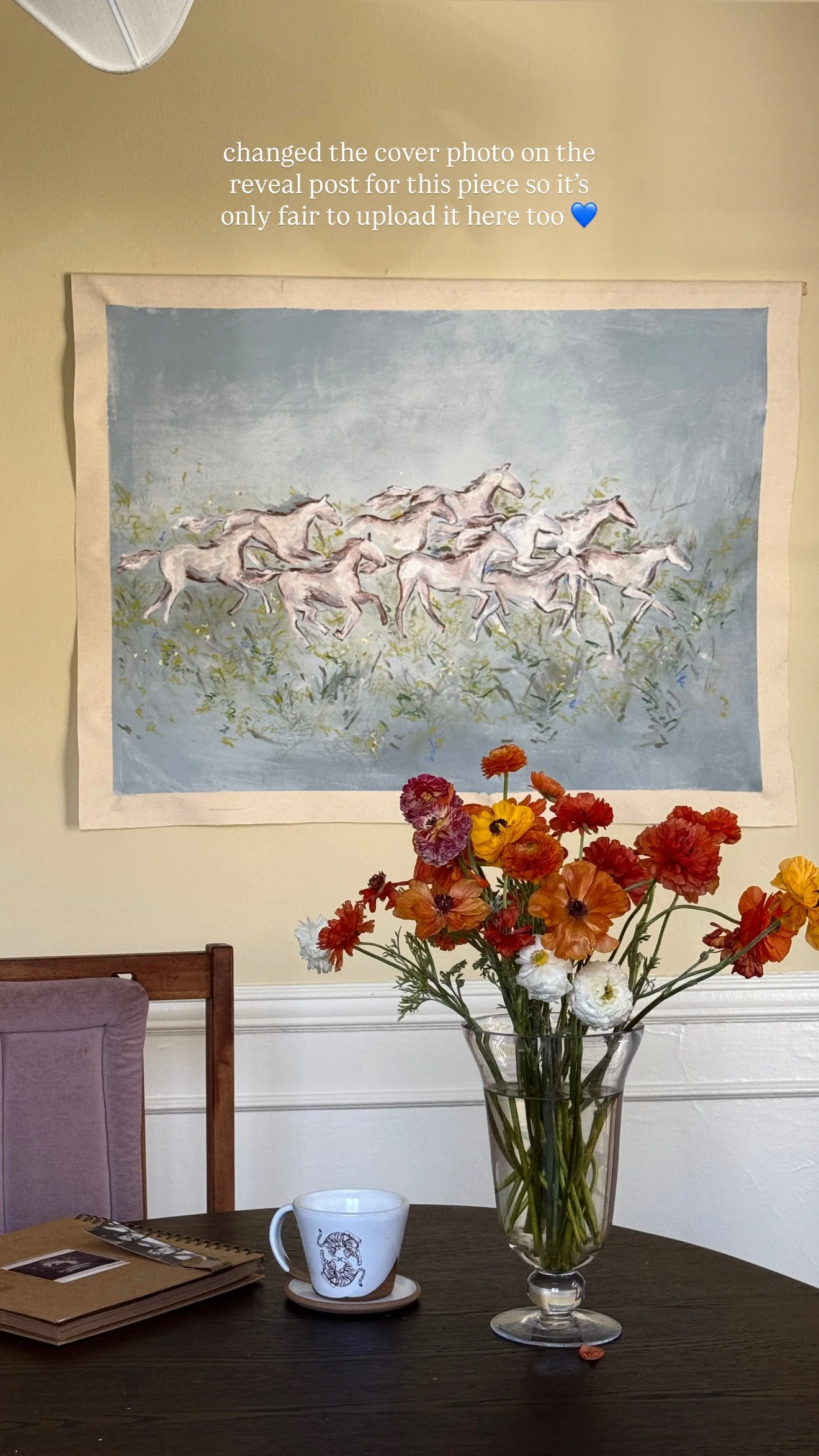 Created with acrylic, oil, and natural materials on raw canvas, the horses run together across an open landscape in a rhythm that feels both wild and harmonious. Their forms remain loose and evolving, capturing motion as something alive rather than fixed.