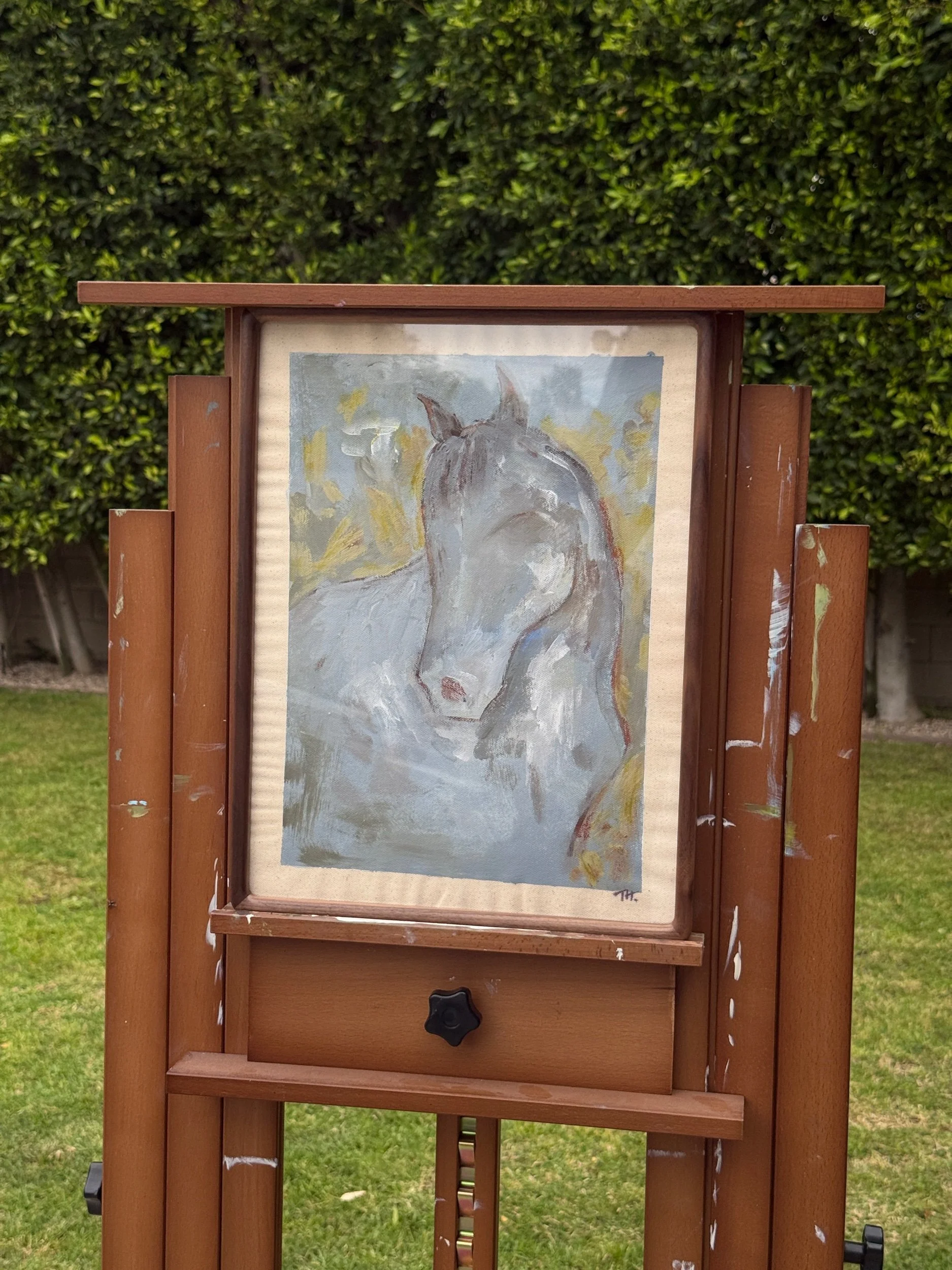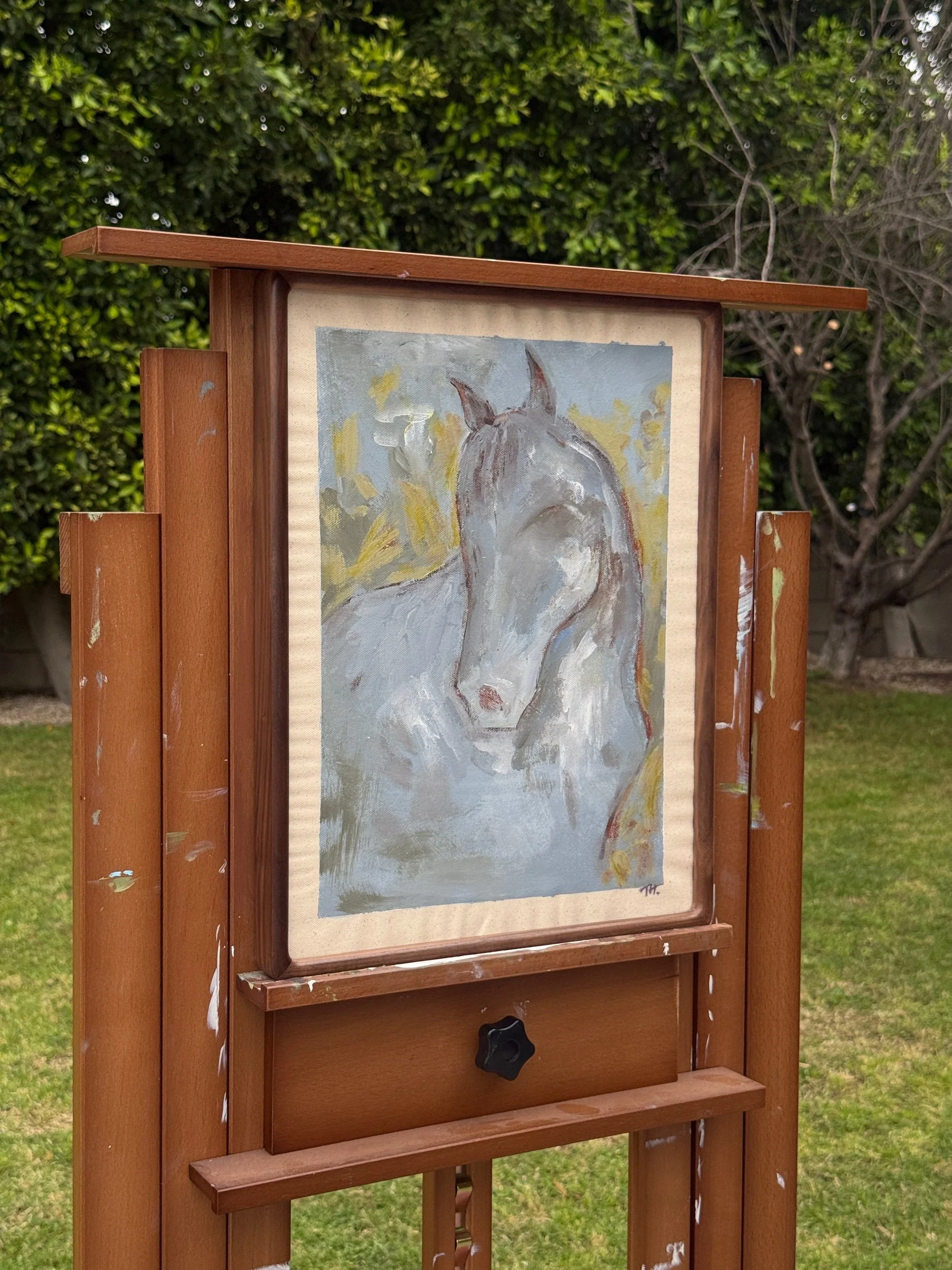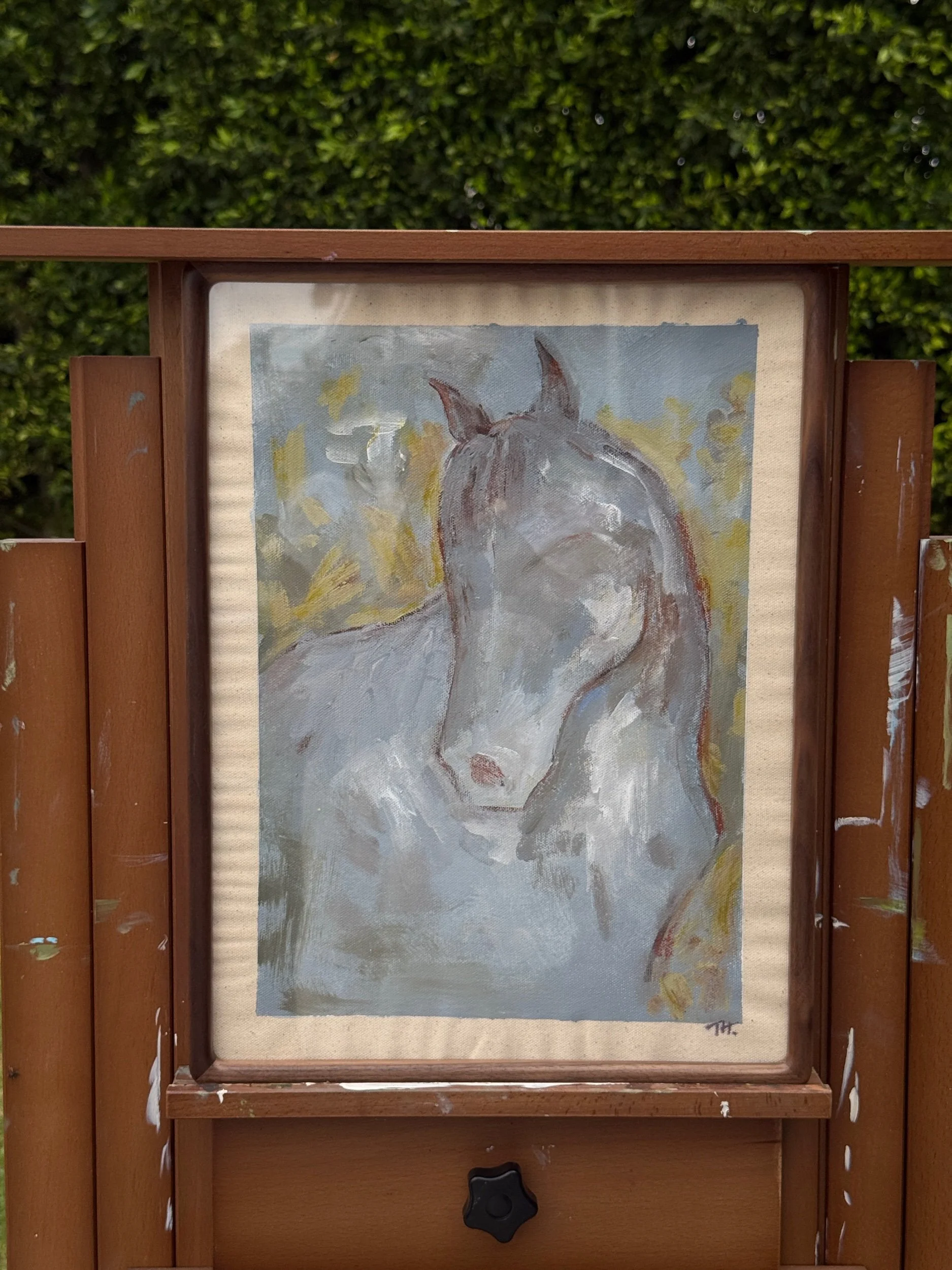 Created with acrylic, oil, and natural materials on raw canvas, this portrait centers a single horse in a softened landscape. The form is loosely rendered and atmospheric, allowing emotion and energy to lead over exact detail.