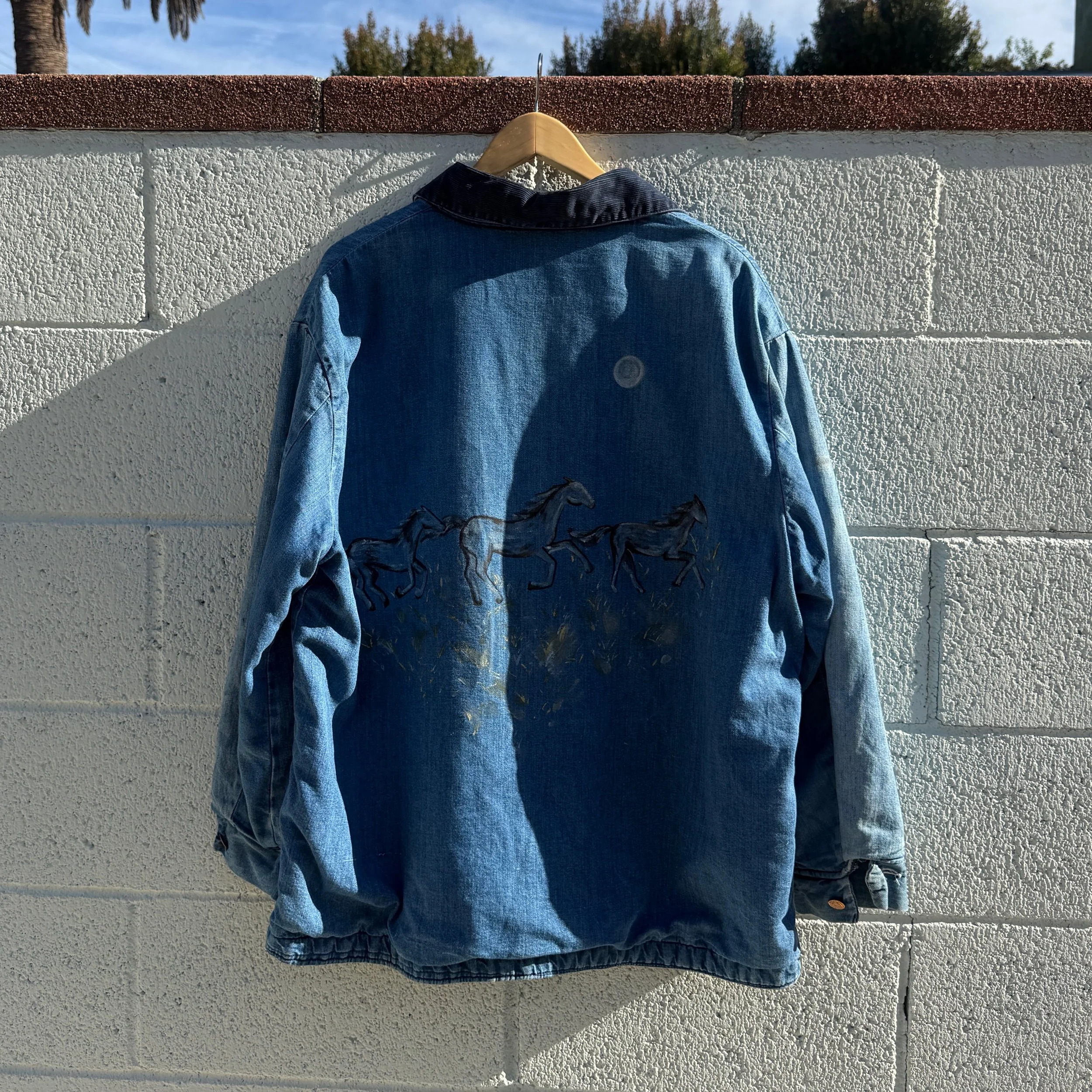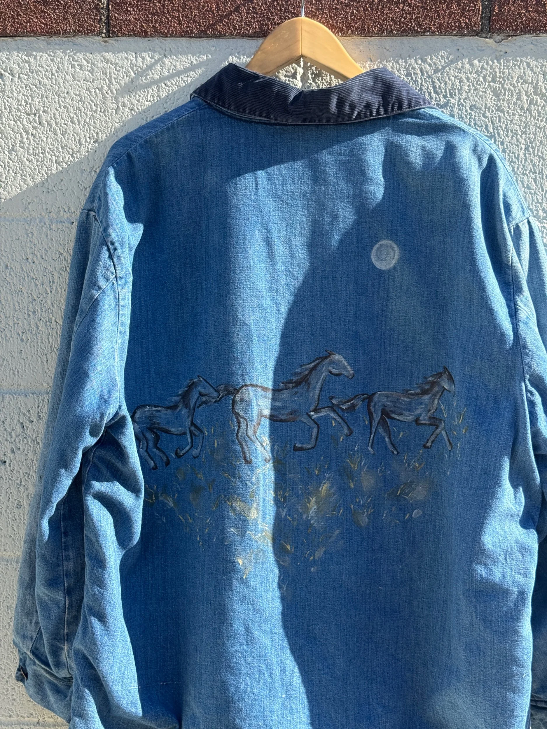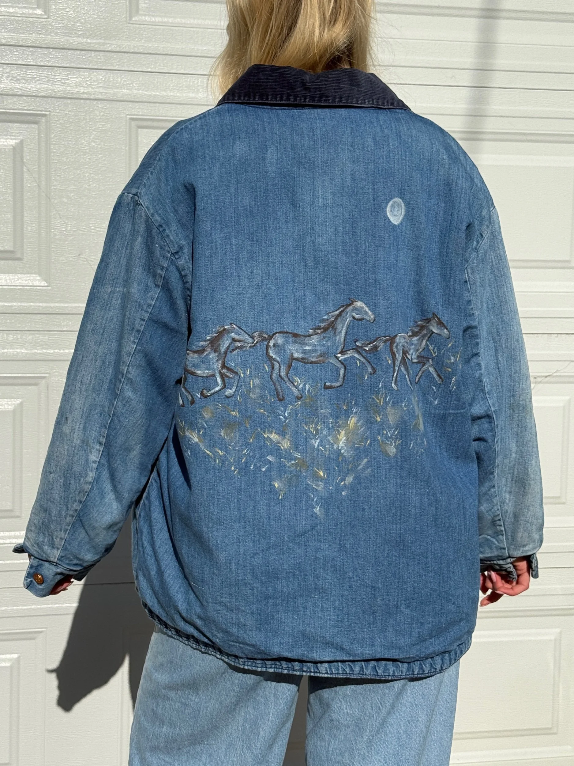 A wearable extension of my Year of the Horse collection, this one-of-one vintage Wrangler chore coat transforms a timeless denim piece into functional artwork. Hand-painted in the same soft, expressive style as the original paintings, three horses move across the back in quiet motion—symbolizing freedom, resilience, and forward momentum.
